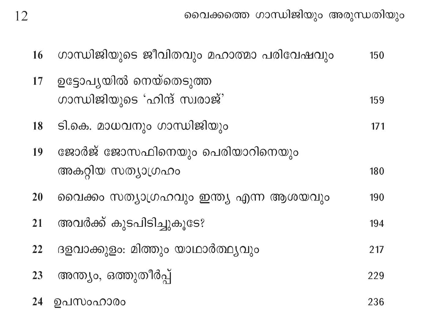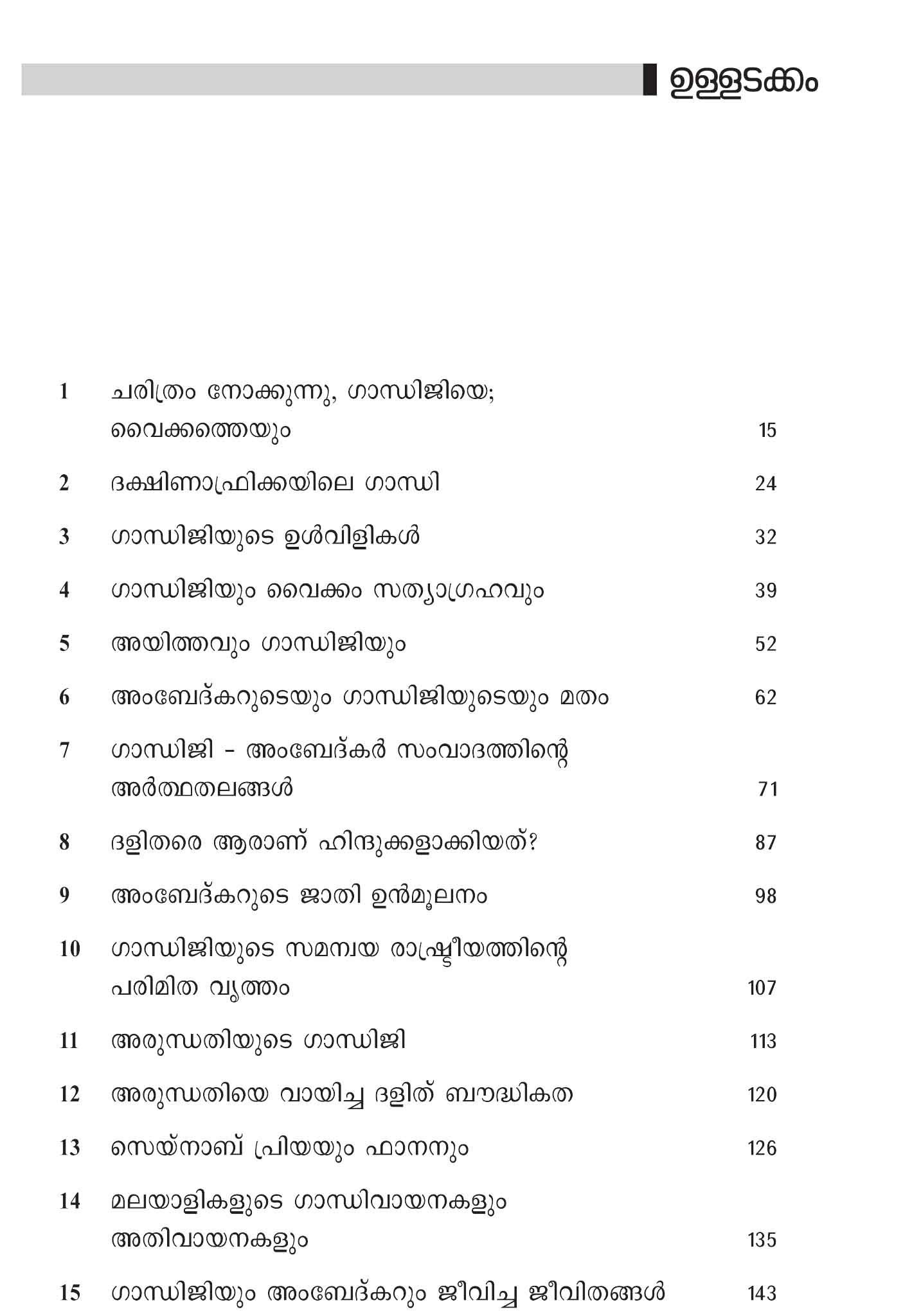 ഗാന്ധിജി വൈക്കത്തെത്തിയിട്ട് 100 വർഷങ്ങൾ കഴിഞ്ഞു. ഗാന്ധിജിയും അംബേദ്കറും തമ്മിലുള്ള സംവാദം നടന്നിട്ടും ഏതാണ്ട് ഇത്രയും കാലമായി. എന്നാലിന്നും അതിന്റെ അനുരണനങ്ങൾ ചർച്ചകളെ കൂടുതൽ സക്രിയമാക്കുകയാണ്. അവർ തമ്മിലുണ്ടായത് രണ്ട് ശരികൾ തമ്മിലുള്ള അഭിപ്രായ ഭിന്നതയായിരുന്നോ?, അതോ തെറ്റും ശരിയും തമ്മിലുള്ള ഏറ്റുമുട്ടലായിരുന്നോ? വൈക്കം സത്യഗ്രഹത്തിന്റെ പശ്ചാത്തലത്തിൽ ഗാന്ധിജി-അംബേദ്കർ സംവാദത്തെ ചരിത്രപരമായി വിലയിരുത്തുന്ന ശ്രദ്ധേയമായ കൃതിയാണിത്. കീഴാള പക്ഷത്തിന്റെയും ഗാന്ധിയൻ പക്ഷത്തിന്റെയും വിമർശനങ്ങൾക്കിടയാക്കിക്കൊണ്ട് ഗാന്ധി വിമർശകയായ അരുന്ധതിറോയി പറഞ്ഞും പറയാതെയും ധ്വനിപ്പിച്ച ചരിത്ര വീക്ഷണം എന്താണെന്നും ഇതിൽ പരിശോധിക്കപ്പെടുന്നു.